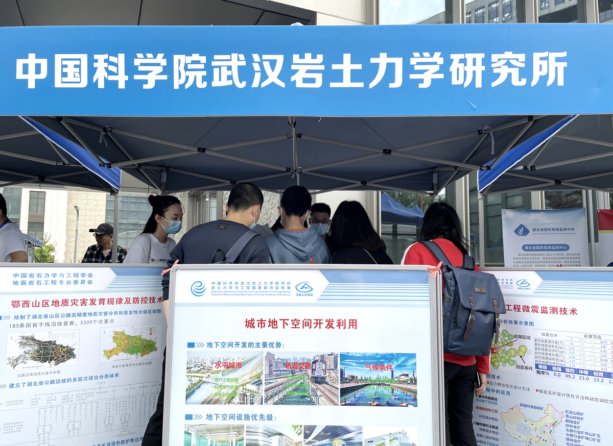 活动当天,武汉岩土所科普小组向参加公众科学日和科技周活动的相关领导和公众介绍了研究所基本情况及相关科研成果,重点介绍了武汉岩土所在地下盐穴储气库、岩爆与微震监测、海上风电场建设、页岩气开发、碳中和等多个领域的相关科研成果、地质灾害发育规律及防控技术和城市地下空间开发利用技术,同时还对参加活动的民众、学生提出的问题进行了耐心解答,并发放活动纪念册,激发了公众、尤其是青少年对岩土科学的关注和兴趣。活动现场气氛热烈,增进了公众对武汉岩土所以及相关科研工作的了解。